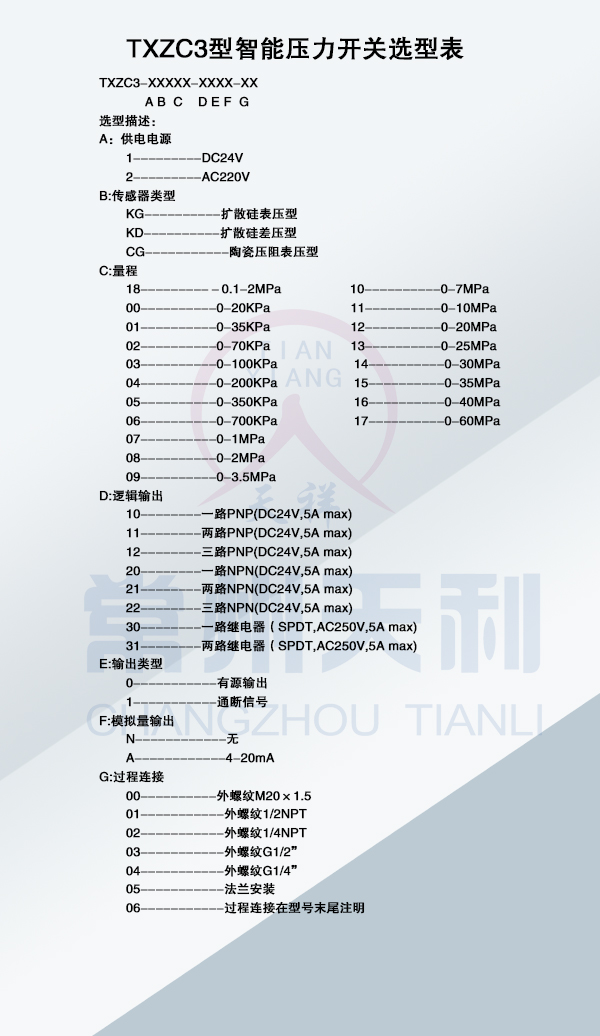 TXZC3型智能壓力開(kāi)關(guān)基本參數(shù)